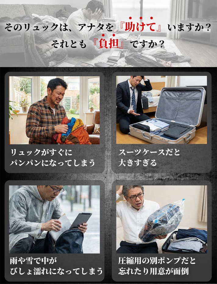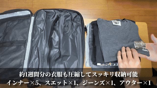 - 圧縮+拡張で旅行から普段使いまですべてこれで完結。機内持ち込みも可能サイズ。※