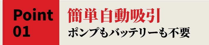 - 外部ポンプやバッテリーは必要なし!革新技術の内蔵ポンプ式。