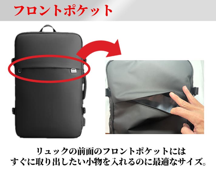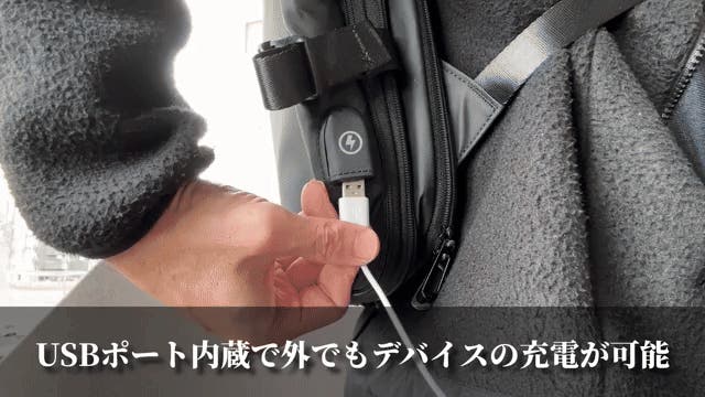 リュックにはUSBポートを内蔵。わざわざカバンの中からモバイルバッテリーを探して取り出す手間が省けます!