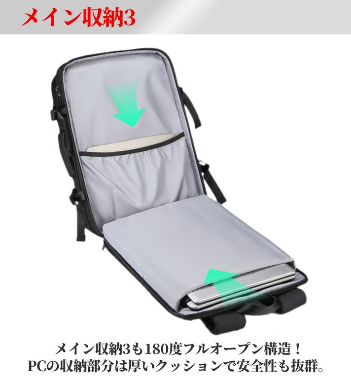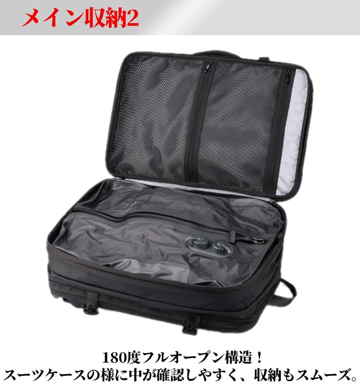 - 豊富な収納スペース。クッション付きポケットは17インチのPCも収納できビジネスにもぴったり。