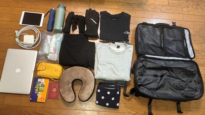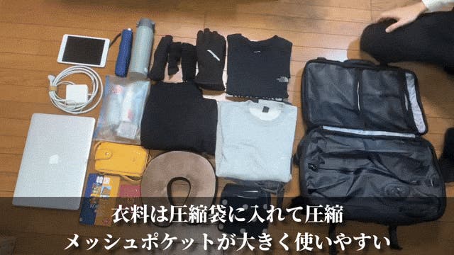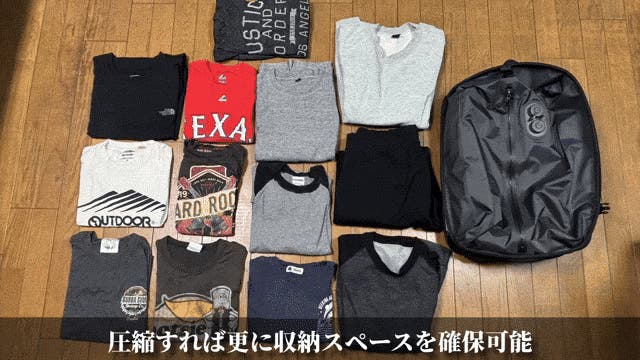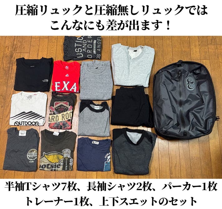 溢れる衣服を圧縮できるから、こんなにもたくさんの荷物をリュックに収納可能!