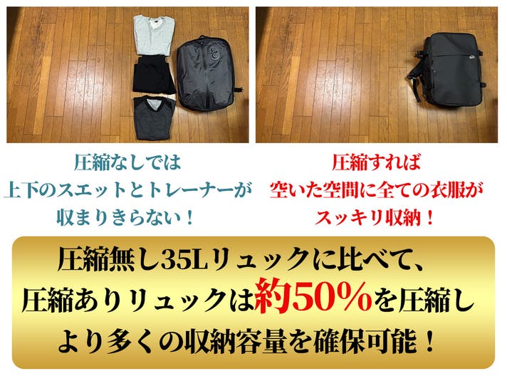 ※双方同じリュックを使用し、圧縮する場合、圧縮しない場合を比べたものです。