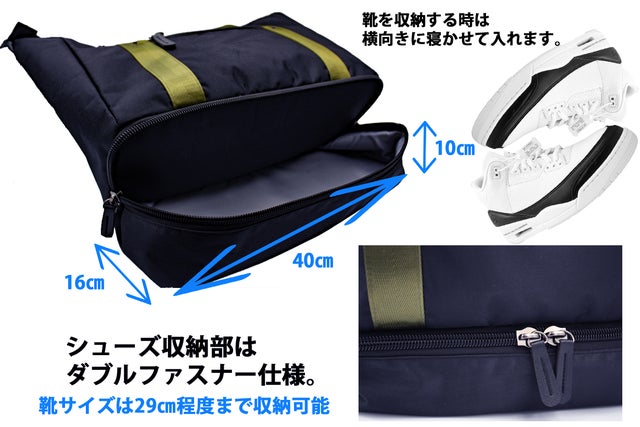 ボトム部分の収納スペースは靴ではなく、ジムで使用した衣類やビーチタオルなど濡れた物を入れたり、におい移りが気になるお弁当などを入れたり仕分けスペースとしても使えます。またオムツ替えシートやオムツ、哺乳瓶などを収納して、夫婦兼用のマザーズバッグとしてのご使用など、ビジネスユースだけでなく多目的にご使用いただけます。
