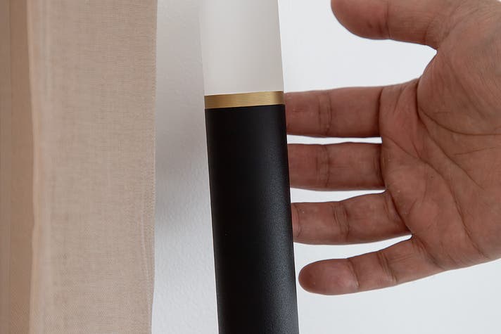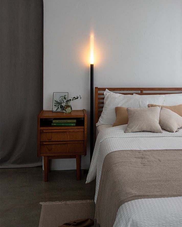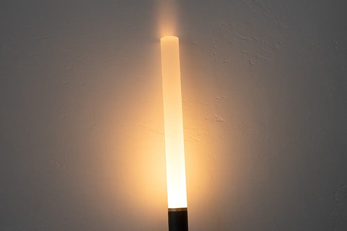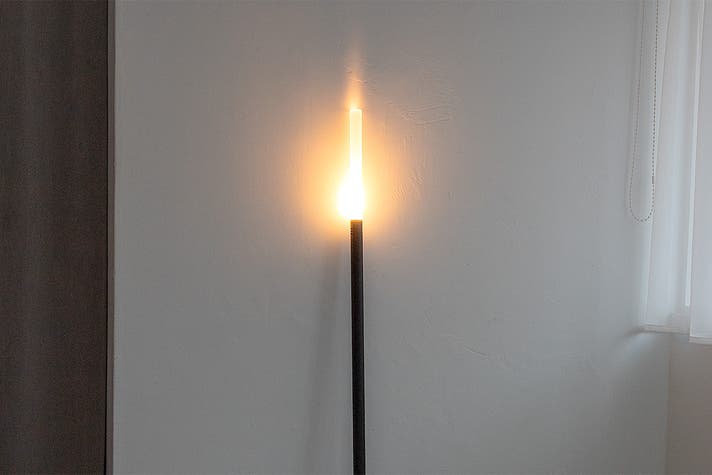 重いベースと大きなシェードを持つ、従来のフロアライトの「常識」をゼロから疑う。たどり着いた答えが、壁を新たなシェードにする、この一本の光です。