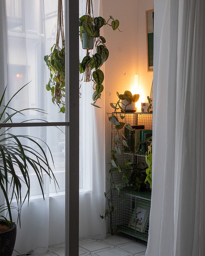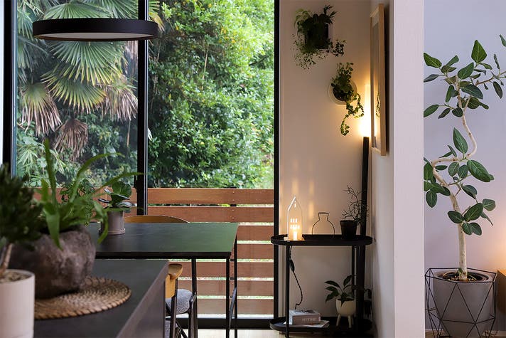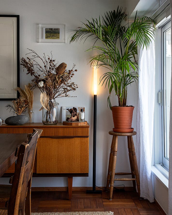 大きなベースもシェードもないので、これまでデッドスペースだったわずかな隙間にもスッと収まります。観葉植物の横にも並んで置けて、圧迫感がまったくありません。