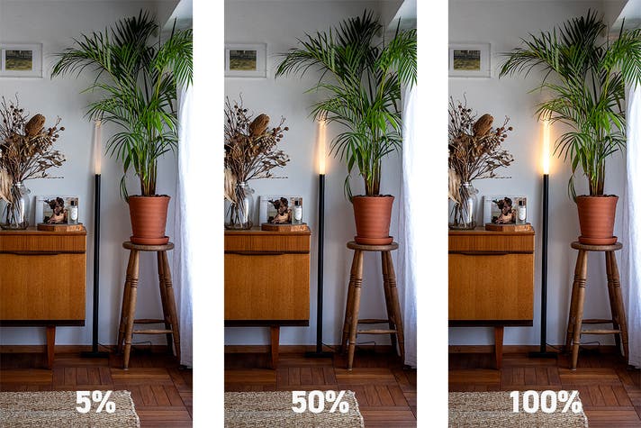 A. NYOIは、お部屋の雰囲気づくりを目的とした間接照明です。部屋全体を照らすメインの照明としては光量が足りませんが、最大で約260ルーメン(25Wの白熱電球相当)の明るさがあり、リビングのムードライトや寝室の常夜灯として、空間を心地よく照らします。また、10段階の調光機能でお好みの明るさに調整いただけます。
