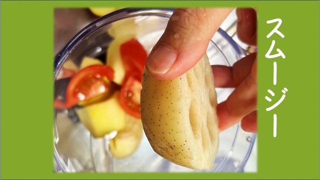 *スムージー 朝のスムージーにはバナナ、ブルーベリー、りんご、トマトなどと一緒に皮ごとれんこんを投入。