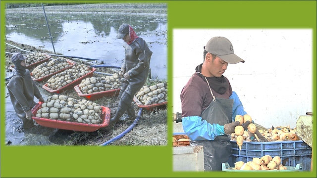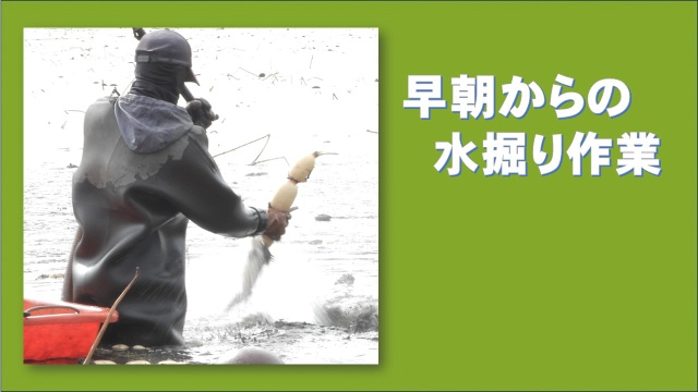 丹精込めて育てられたれんこんの収穫は早朝から始まります。ポンプを使った水堀りという方法で傷つけないように丁寧に収穫。それを一つ一つ手作業で綺麗にして、品質を管理しています。