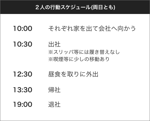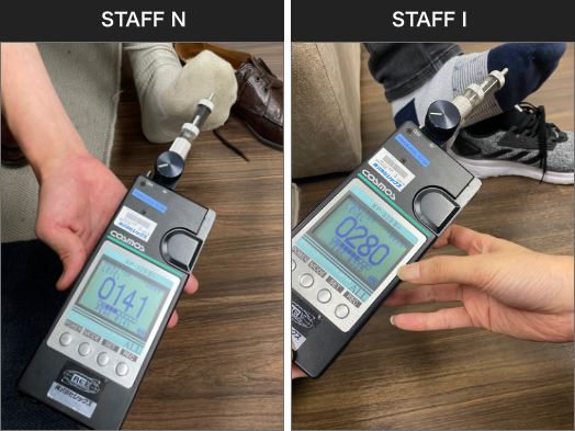 「O-DRESS」を履き、一日目と同じ靴で生活を送る。19:00にニオイチェッカーで足のニオイチェック。