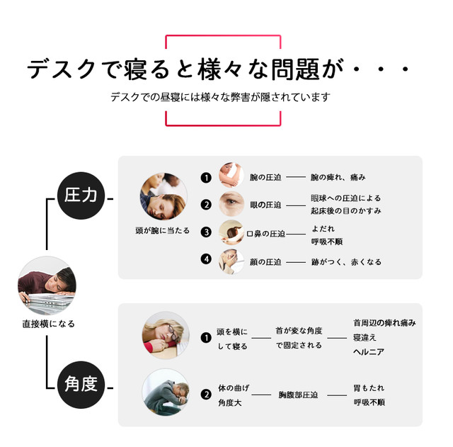 デスクで寝ようとすると、腕がしびれたり、顔に跡がついたり、よだれが垂れたり、肩や首筋が痛くなったりとあまり快適ではなく、せっかく寝たいのに中々寝付けないなんてことも。
