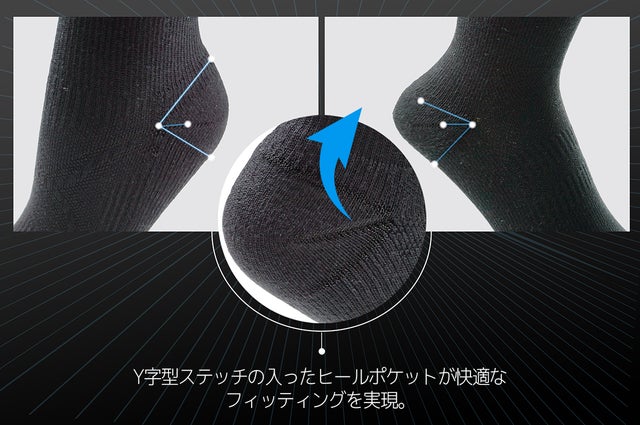 Y字型のヒールポジショニングテクノロジーにより、靴下はつま先からかかとまでしっかりと締め付け、滑り落ちにくく、快適なフット感を体験することができます。