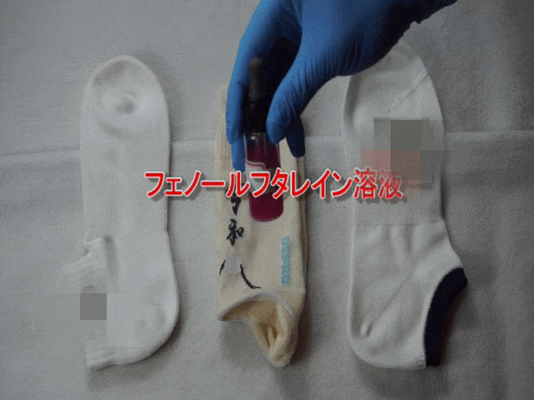O5PRO靴下はピンク色がどんどん薄くなり臭いを吸収(消臭)し、フェノールフタレインの元の透明の色に戻っていくことが確認することができます。
