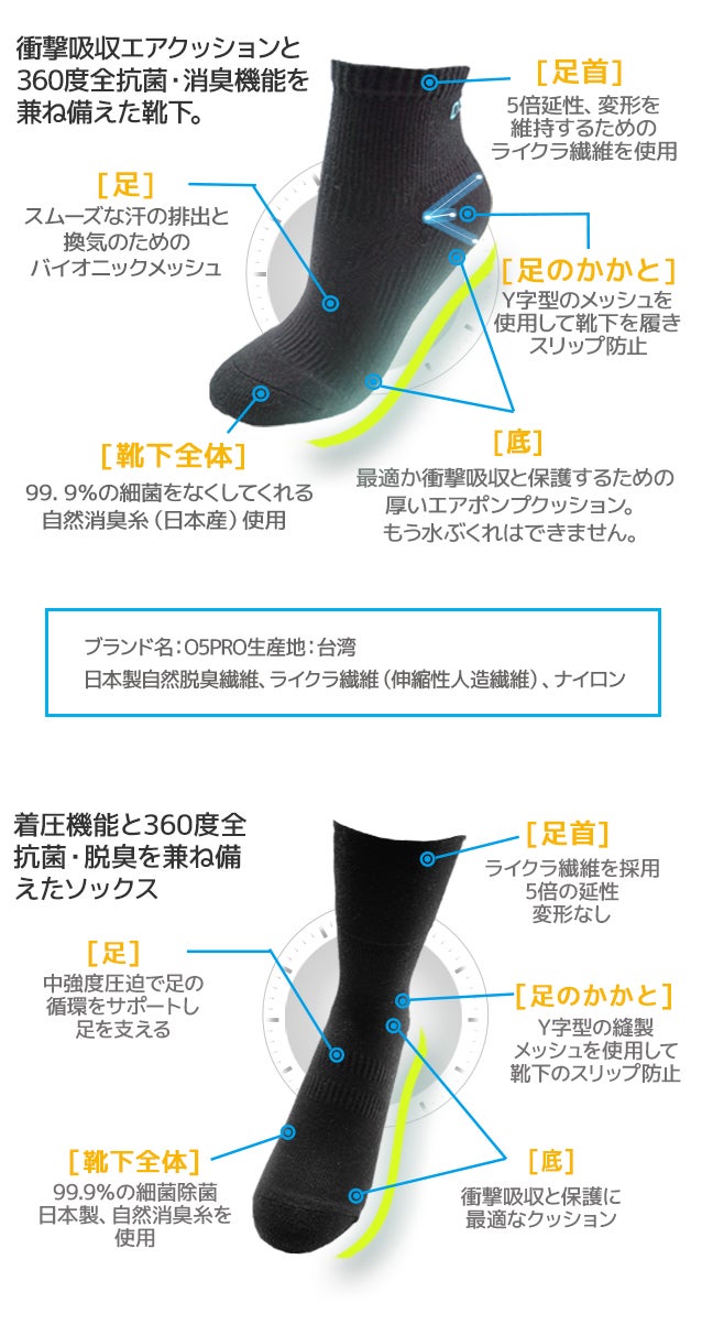O5PROの消臭技術はナノテクノロジーによって生地が作られており、汗やニオイが繊維に吸収され、悪臭を除去してくれます。生地自体の特性により、何度洗っても靴下の消臭機能を新しく戻すことができます。