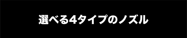 標準ノズルに加え、3タイプのノズルが付属します。状況に合わせて使い分けることができるので、どんなシュチュエーションでも便利です。