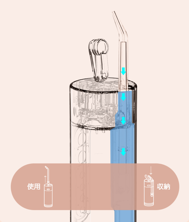 「ポータブルジェットウォッシャー」は、片手で持てるコンパクトサイズで持ち運びがらくらくです。外出先やオフォイスでも、お口のなかをスッキリさせることができます。