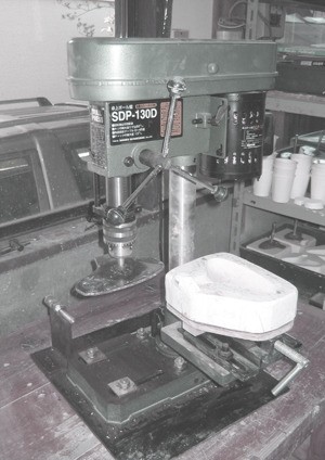 石膏で出来た外型と金属板に取り付けた内型をボール盤に取り付け、ボール盤のハンドルを押し下げて成型し上下それぞれを作ります。次に歌口(音の出る穴)を加工し、トーンホール(音階の穴)をあけ、上下を張り合わせて仕上げ後、乾燥、焼成、調律して完成となります。