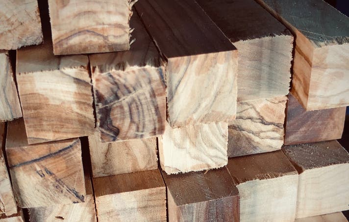 ボールペンに生まれ変わるのを待つ、オクシタニア産プラタナスの木材。