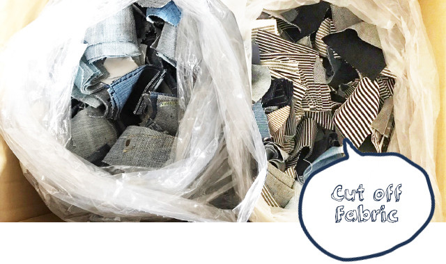 衣料品の縫製工場では製造過程でたくさんの裁断クズ(生地)が出て、それらは何の使い途もなく捨てられるだけだということも聞いていました。