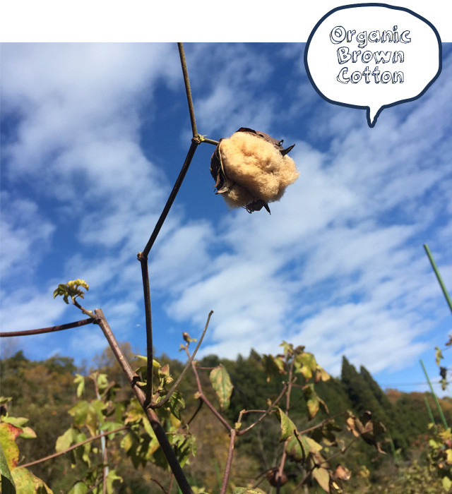 このプロジェクトで育てている綿は、日本の在来種である茶色の和綿です。在来種は品種としての特性が親から子、子から孫へと保たれ世代を超えて存続していきます。循環型の社会を目指す、このプロジェクトの理念の象徴として、この茶色の和綿にこだわって栽培しています。