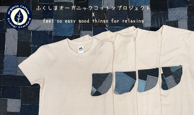 日本国内でオーガニックコットンを栽培し、製品化および販売している「ふくしまオーガニックコットンプロジェクト」の商品は「潮目」というブランドで展開されています。その「潮目」ブランドのTシャツと、「feel so easy good things for relaxing/Reused Product(リユースプロダクト)」のコラボレーション企画として、