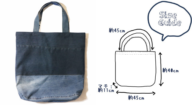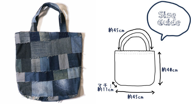 古着ジーンズを解体して、つなぎ縫い合わせたトートバッグ。