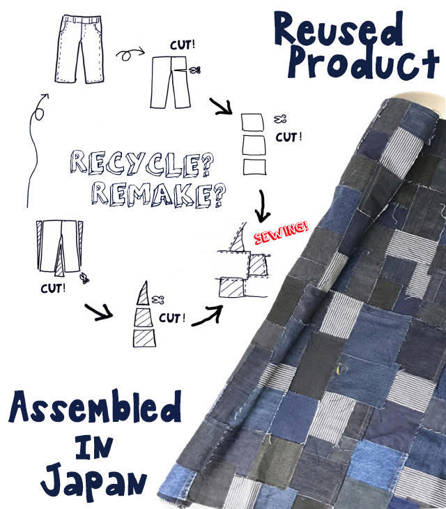 縫製工場で出る裁断クズと、古着ジーンズをカットしたものをつなぎ縫い合わせてパッチワークプレートを作り、色々なアイテムに利用していくということを思いつき実行すべく動き出しました。