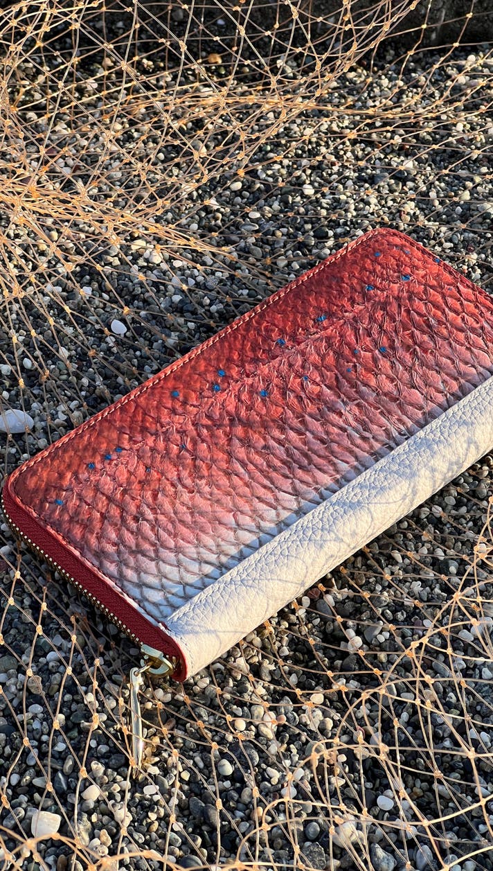 「魚の皮で美しい革を作り、財布や小物にしたらどうだろう?」すぐに実験を始め、家にある材料で試行錯誤の日々を送りました。何度も失敗を繰り返しながらも、ようやく販売できる品質のフィッシュレザーにたどり着きました。