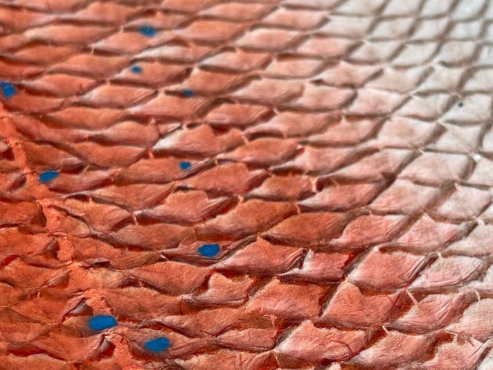 しかし、課題はまだ残っていました。革にする過程で使う「植物タンニン」により、どうしても色が薄茶色に変わってしまい、魚本来の美しい模様が残せないのです。当初イメージしていた剥製のようなリアルな質感を表現できない悔しさが募りました。