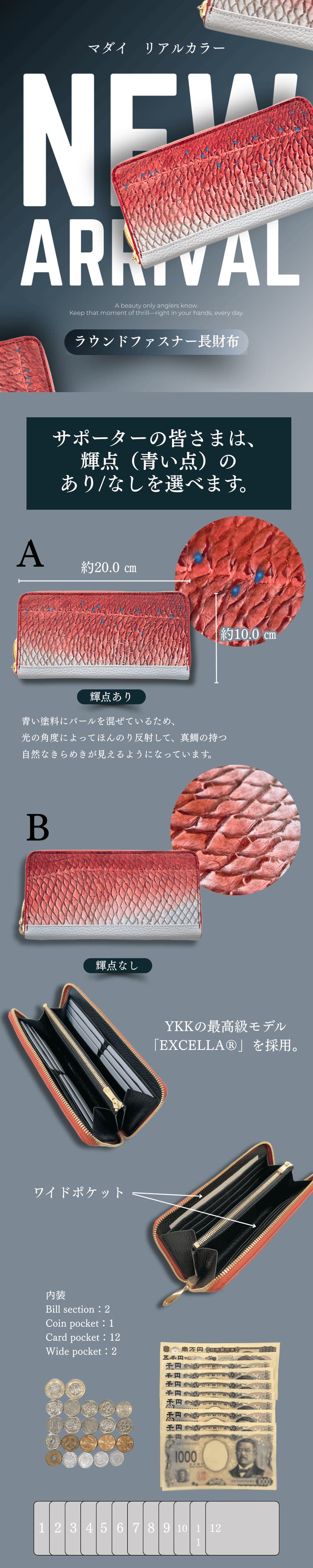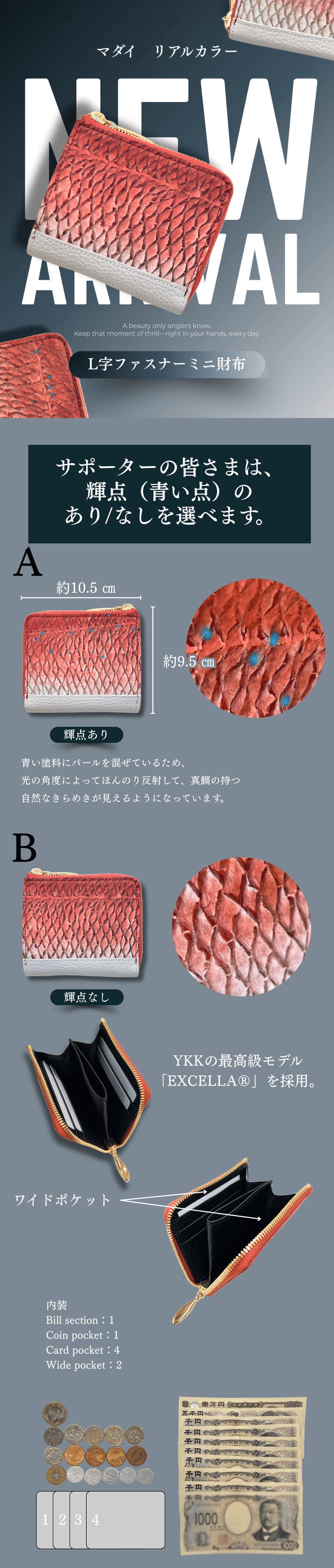 開発に5年かけたリアルカラー製品 第一弾「鰤を持ち歩く」。ラウンドファスナー長財布、折り長財布、名刺入れをご用意しました。
