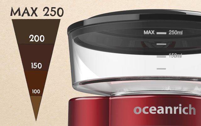 給湯サーバーはお湯が注ぎやすいように開口部の広いクープグラスのような形状。最大湯量はoceanrich ファーストモデルご愛用者様からの「もっと大容量で楽しみたい!」という声にお応えして、250mlに改良しました。マグカップでコーヒーを楽しみたい方にも満足いただける容量となっています。