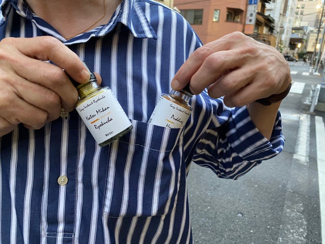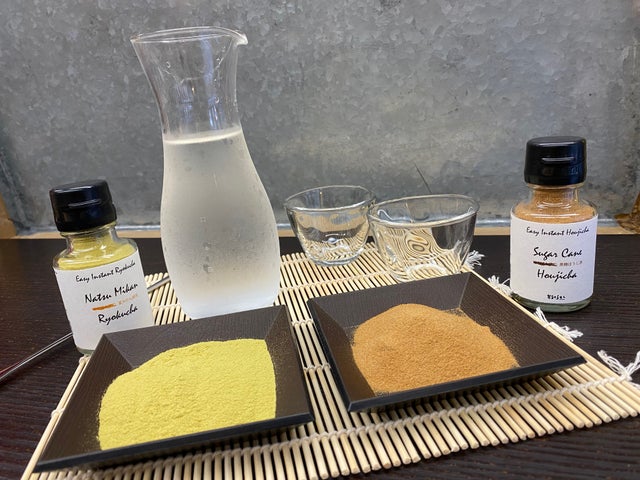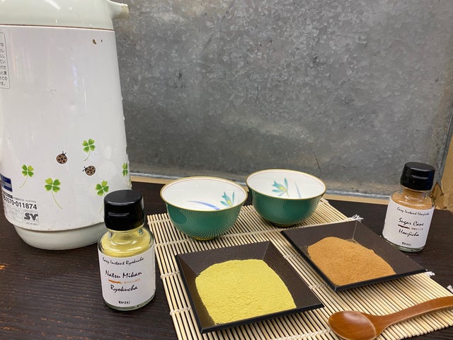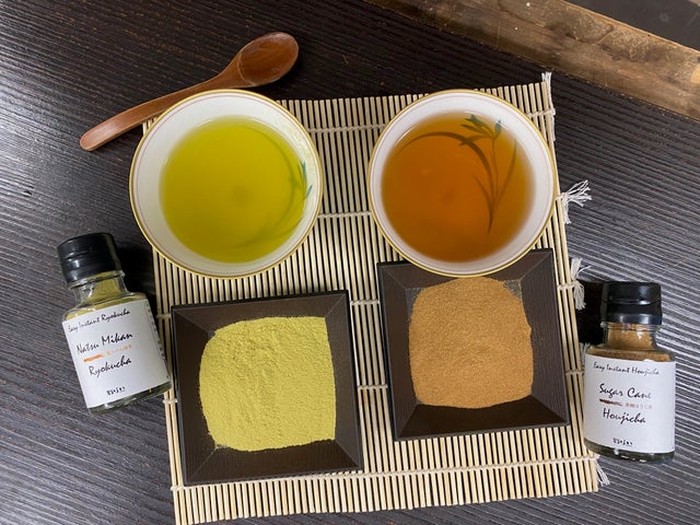 - 食卓用の小瓶詰めインスタント エキスパウダーフレーバー日本緑茶とフレーバーほうじ茶です。
