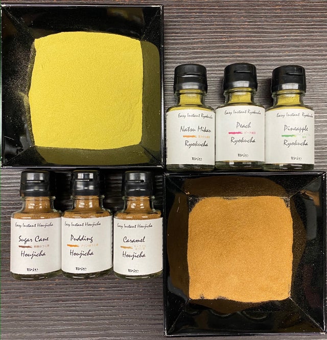 茶葉をパウダー形態で提供できる会社と提携し、緑茶で三種類(夏みかん、ピーチ、パインアップル)、ほうじ茶で三種類(キャラメル, 黒糖, プリン)の茶香をします。