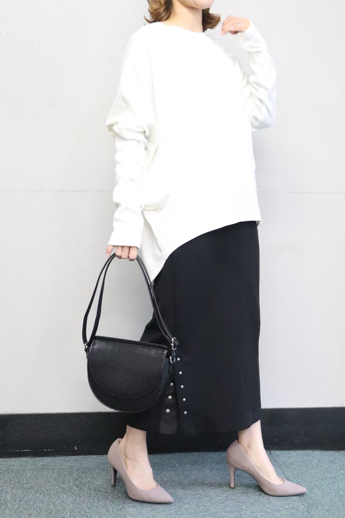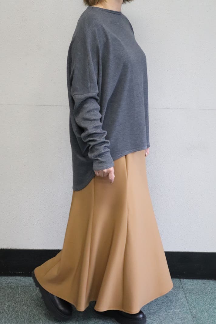 後ろ下がりのシルエットで、裾の長さは前後で10cmほど差があります。