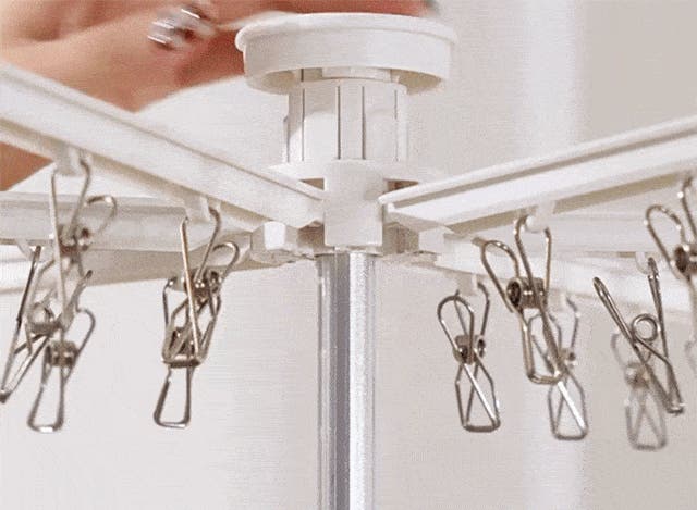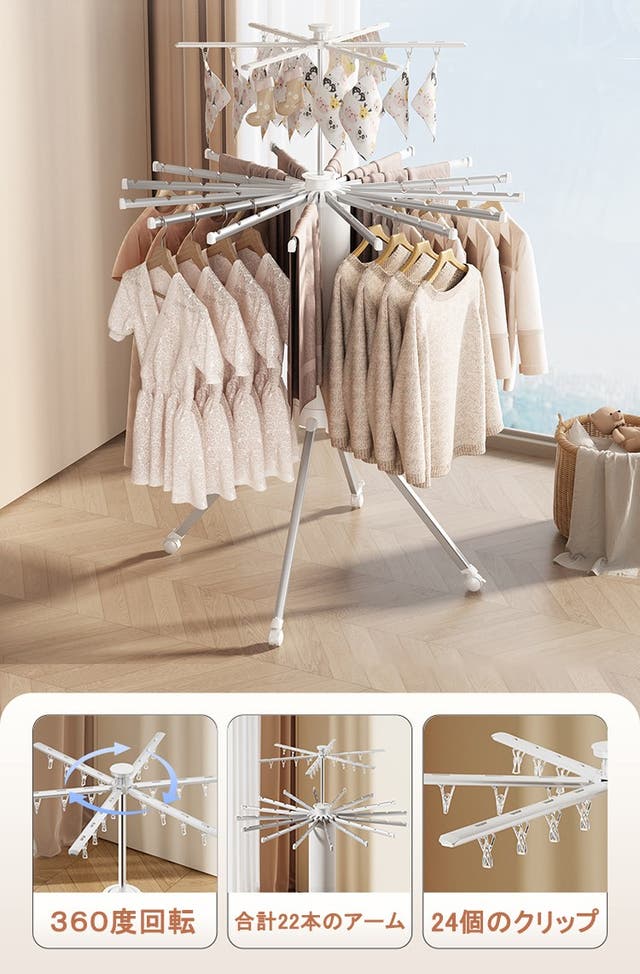 22本のアームを2段に配置しており、タオルから小さなアイテムまで大量に干せます。自立型の設計なので、吊るすスペースがない場所や物干し竿のない家庭でも利用可能です。4本の脚が安定性を高め、風の強い屋外での使用にも適しています。