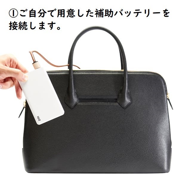 A. 充電パッドに入った送電コイルに電気を流すと磁界が発生し、携帯電話の受電コイルに電気を流します。置くだけ充電の仕組みを応用したバッグです。