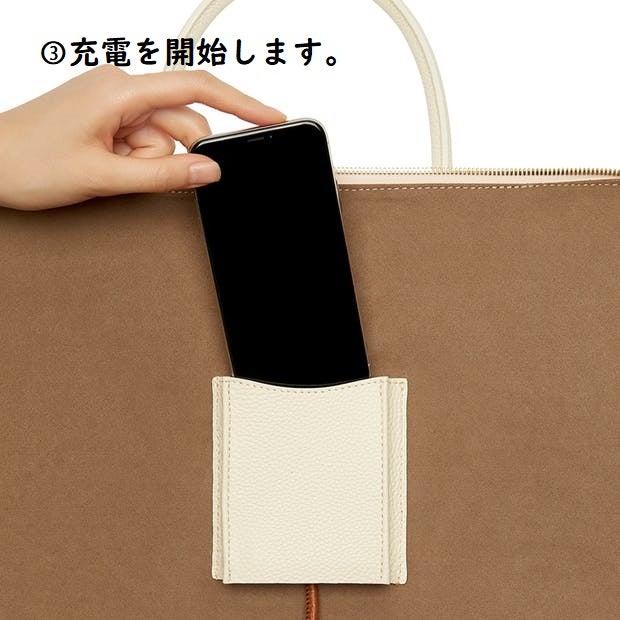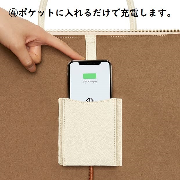 - ポケットにスマホをしまえば充電が完了!充電可能なポケットは内側にも外側にも用意しています。