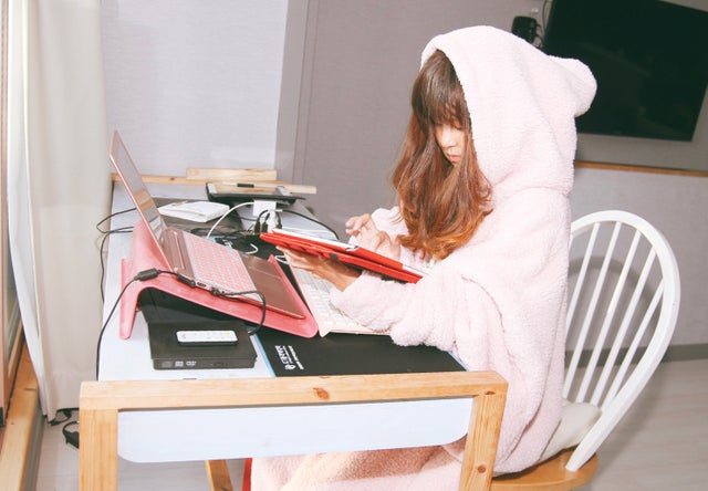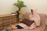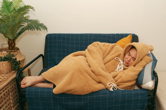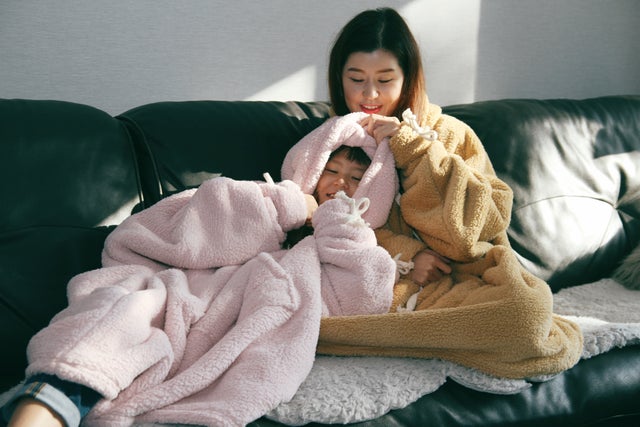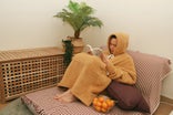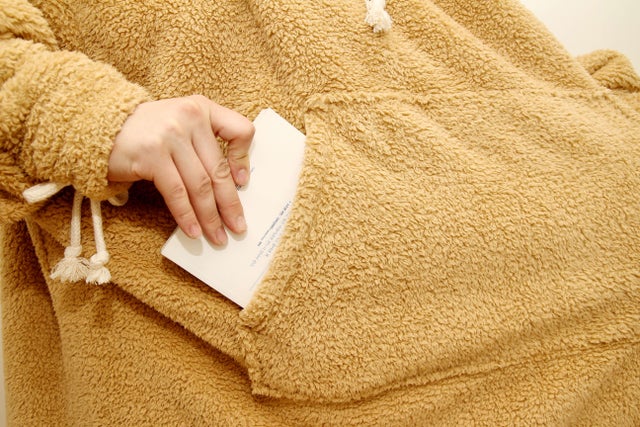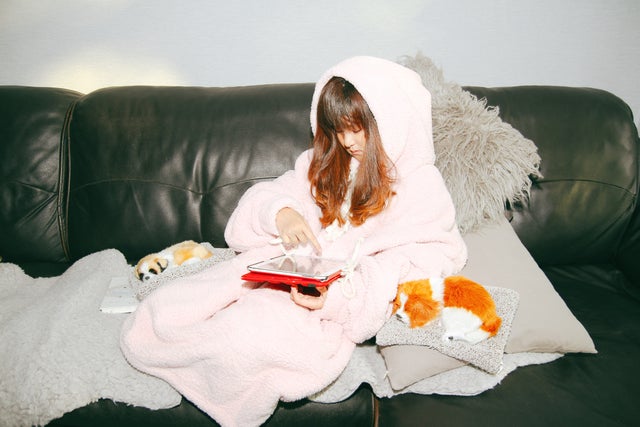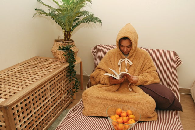 オディブルはフリーサイズに作りました。180cm の成人男性も余裕に着れます。最初にオディブル受け取ると思った以上な大きさで驚くかもしれません。大きいサイズで製作した理由は、ベッドやソファでどのような姿勢でいても、体全体を包み込んでくれるようにしたかったです。成人男性があぐらをかいて座っても足全体を暖かく包んでくれるオディブルは、家でPCを使っている時、読書する時、休息をとる際に最適な服装だと思います。