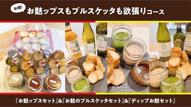 『お麩のブルスケッタ1セット』と、『ディップお麩1セット(お麩ップスのガーリック10枚+ディップソース3種類)』をご自宅までお届け!