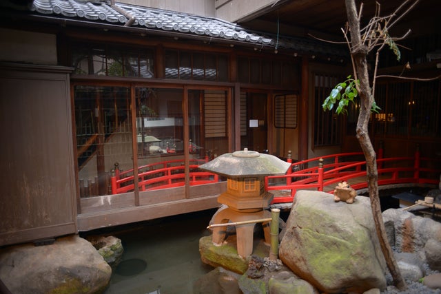 重厚感かつ開放的なメインエントランスから中へ入ると、すぐに中庭兼池が見え、視界が開けます。そしてそのまま通路を進むと突き当り、右手にあるのが当店です。屋根をそのまま生かした抜け感のある天井により、開放感を感じられる心地よい空間となっています。ブラウンの木部が落ち着いた印象を与える、ぬくもり溢れる癒しの空間です。