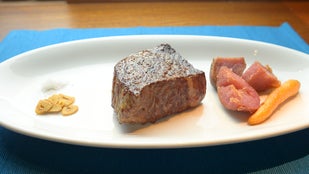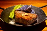 分厚い江刺牛を炉窯で焼きあげ、温めたお皿に盛り付け、肉本来の味が楽しめる様、シンプルに塩のみでお召し上がりください。