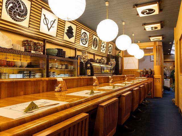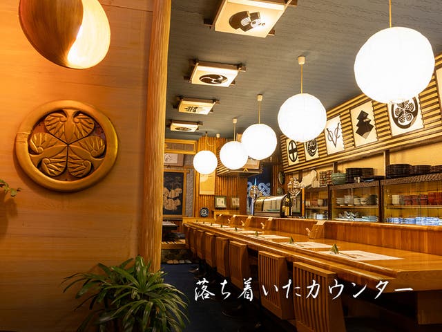 大女将が北九州のご出身との事で、江戸時代の小倉藩主の小笠原氏から屋号を頂いたそうです。カウンター席は家紋越しの照明が上質な存在感を放ち、心地よく包み込んでくれます。