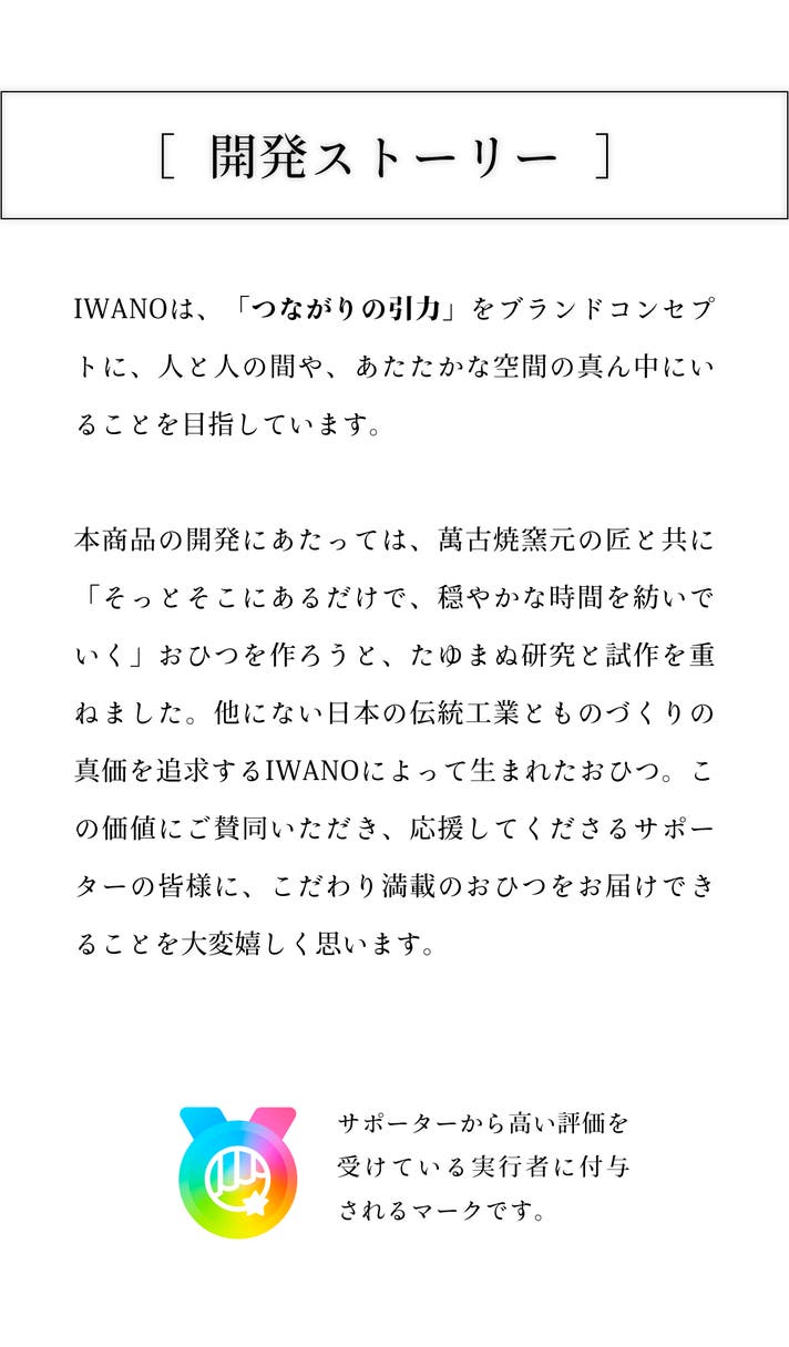 【配送遅延とキャンセルについて】 本文中に記載させていただいたスケジュールは、あくまでプロジェクト公開時点の予定です。応援購入の性質上、配送遅延のおそれがございます。原則として、配送遅延に伴う応援購入のキャンセルはできませんが、リターン配送予定月から 3ヶ月 を超えた場合には、希望者に限りキャンセルにて対応させていただきます。 【商品等の不具合による返品・交換】 原則として、サポーター都合によるキャンセル・返金は承っておりません。 (サポーター都合のキャンセル不可の例:サイズが合わない、誤注文、長期不在) ◾️対応条件: 商品の初期不良、またはお届けした商品がご注文内容と異なる場合、到着後14日以内にプロジェクトページの「実行者にメッセージ」よりご連絡ください。状況を確認の上、返金対応、または良品との交換対応をさせていただきます。 ◾️返金額: リターン金額(税込)の全額 ◾️返品送料/再送料: 実行者負担 【返品・交換をお受けできない商品】 ・サポーターの責任により破損、汚損が生じた商品 ・商品のタグ、付属品、パッケージ(箱、袋など)を紛失、破棄された商品 ・事前にご連絡をいただいていない商品 ・商品到着後、15日以上経過した商品 【交換をお受けできないケース】 ・限定品や同一商品の在庫がない場合など、代替品をご用意できない商品