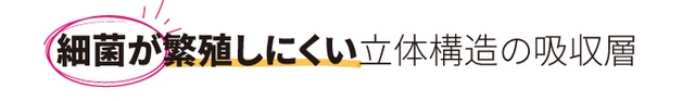 Ohnolaトイレ吸収層は複合的で立体的な構造の特性上、細菌が滞留できる部位が狭く、 原糸も湿気を持ちにくいメッシュ素材であるため、細菌が繁殖しにくいです。