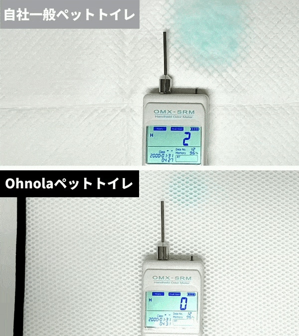 Ohnolaトイレの臭い数値は使い捨てペットシートに比べて70%ほど少ないことが確認できます。