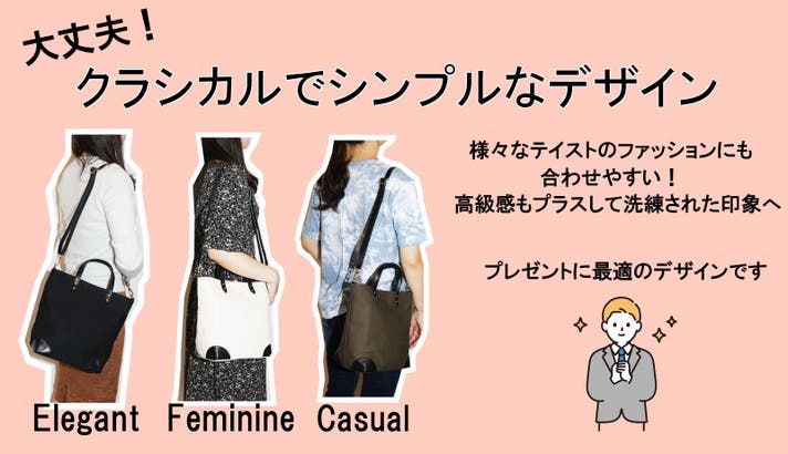 当社で企画開発したデザインで販売当初よりお客様から大人気で在庫切れが続いたバッグです。流行りに左右されない、クラシカルなデザインで機能的に使いやすいバッグです。好みのお色を贈れる様に、9色の色味をご用意しました。
