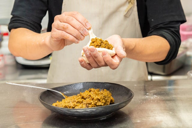 能登牛と国産野菜とを使用し、店舗でじっくり煮込んだスパイシーなカレールーを、沢山包み込みます。