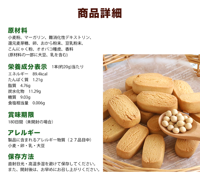 小麦粉、マーガリン、難消化性デキストリン、還元麦芽糖、卵、おから粉末、豆乳粉末、