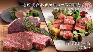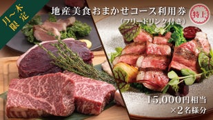 シェフが厳選した日本各地の美食を詰め込んだ“地産美食のおまかせコース【上】”の2名様分利用券。メインには「北海道産サロマ黒牛のサーロイン炭火焼」をご用意します。