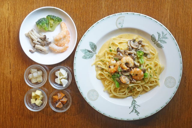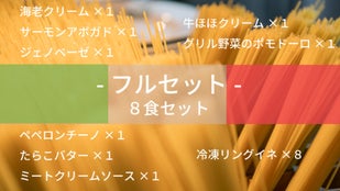 ペペロンチーノ×1、たらこ×1、ミートクリームソース×1、グリル野菜のポモドーロ×1、ジェノベーゼ、サーモンアボカドクリーム×1、海老クリーム×1、牛ほほクリーム×1、クイックパスタ(冷凍リングイネ140g)×8