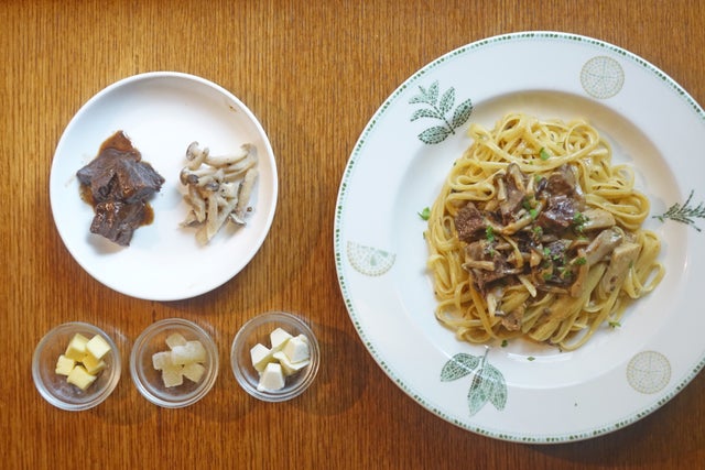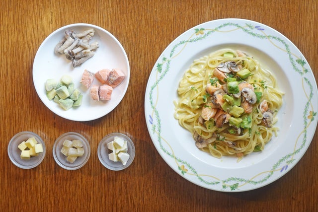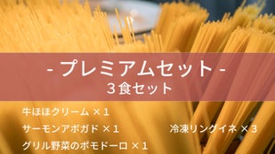 牛ほほクリーム×1、サーモンアボカドクリーム×1、グリル野菜のポモドーロ×1、クイックパスタ(冷凍リングイネ140g)×3